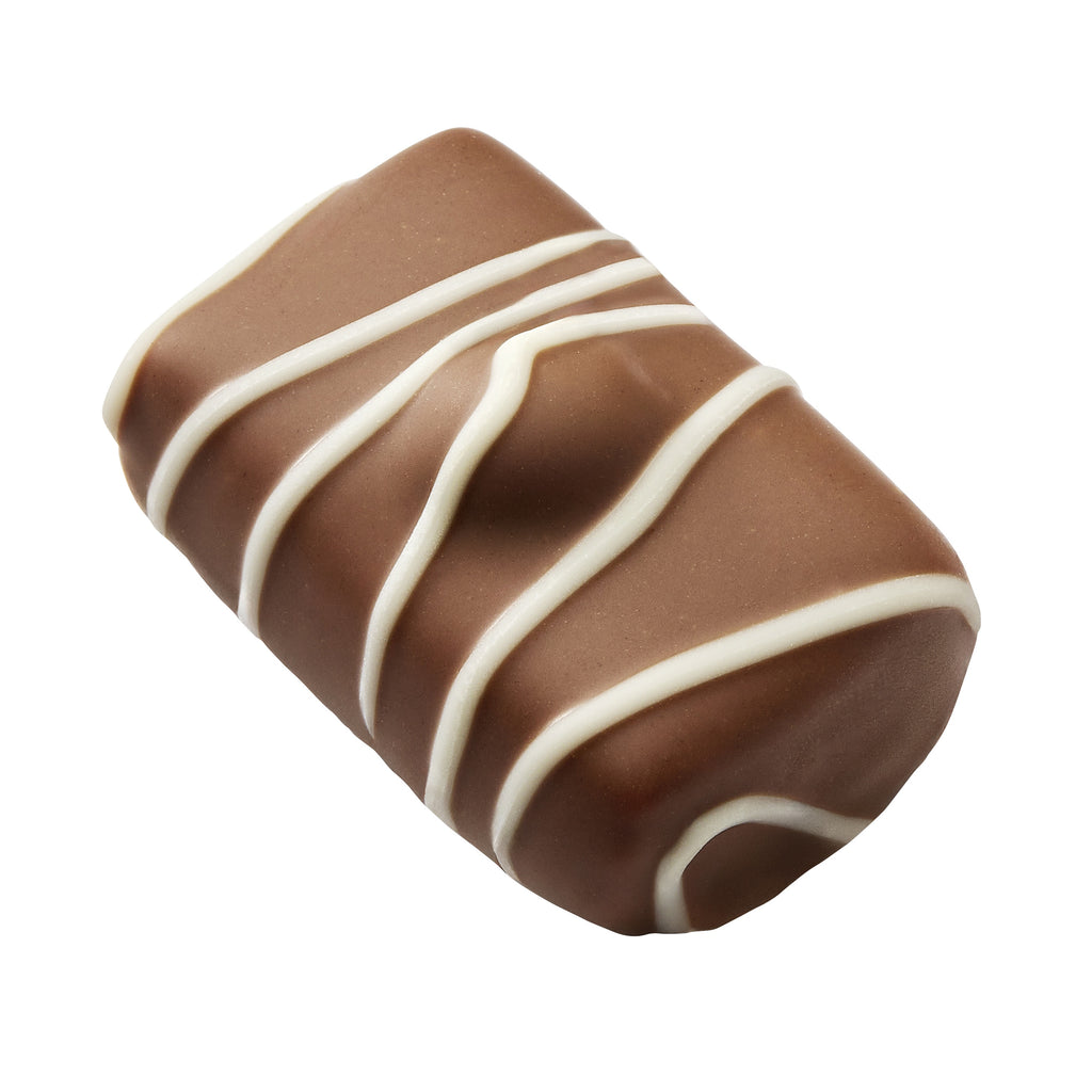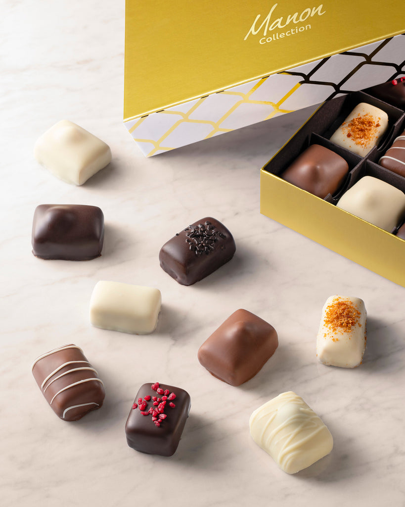 • Manon lait : coque de chocolat au lait, crème au beurre saveur café, praliné et noisette entière