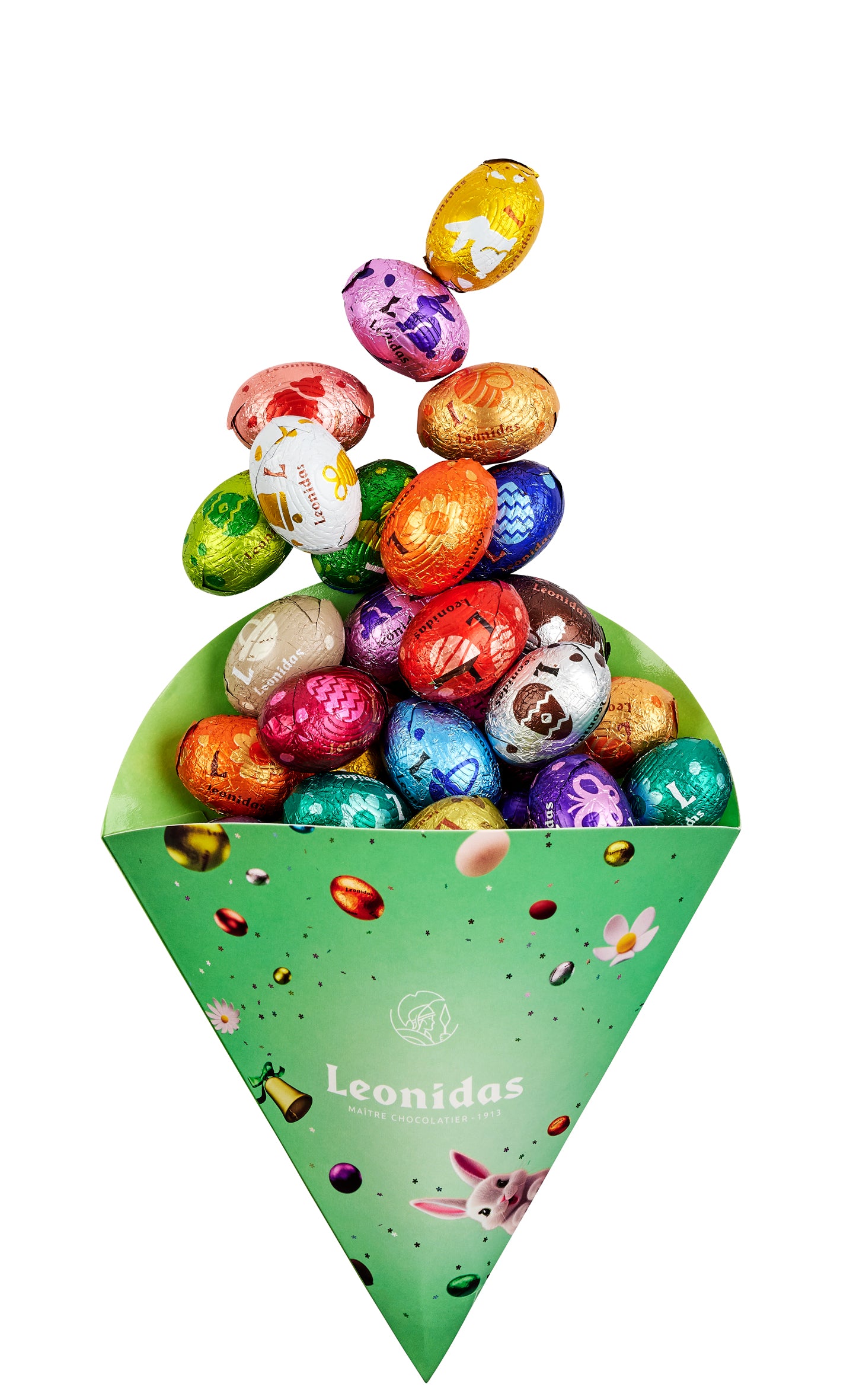 Toute la variété des petits œufs de Pâques Leonidas dans un joli cône aux couleurs de la saison. Chocolats au lait, noir, blanc, praliné, caramel, pâte noisette, vanille, … Il y en a forcément pour tous les goûts.